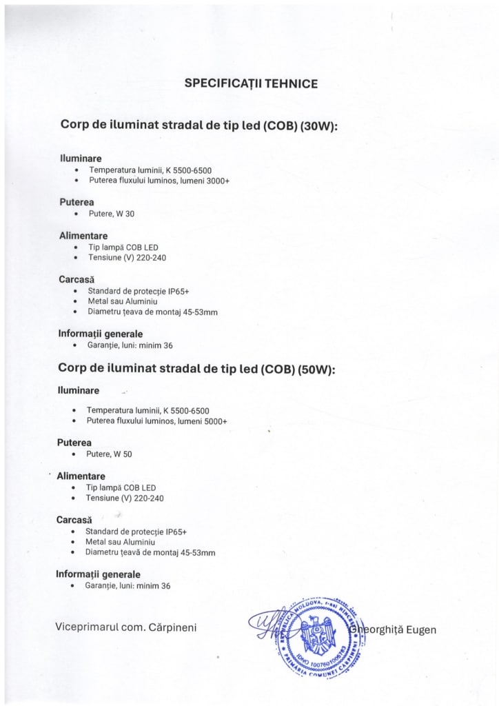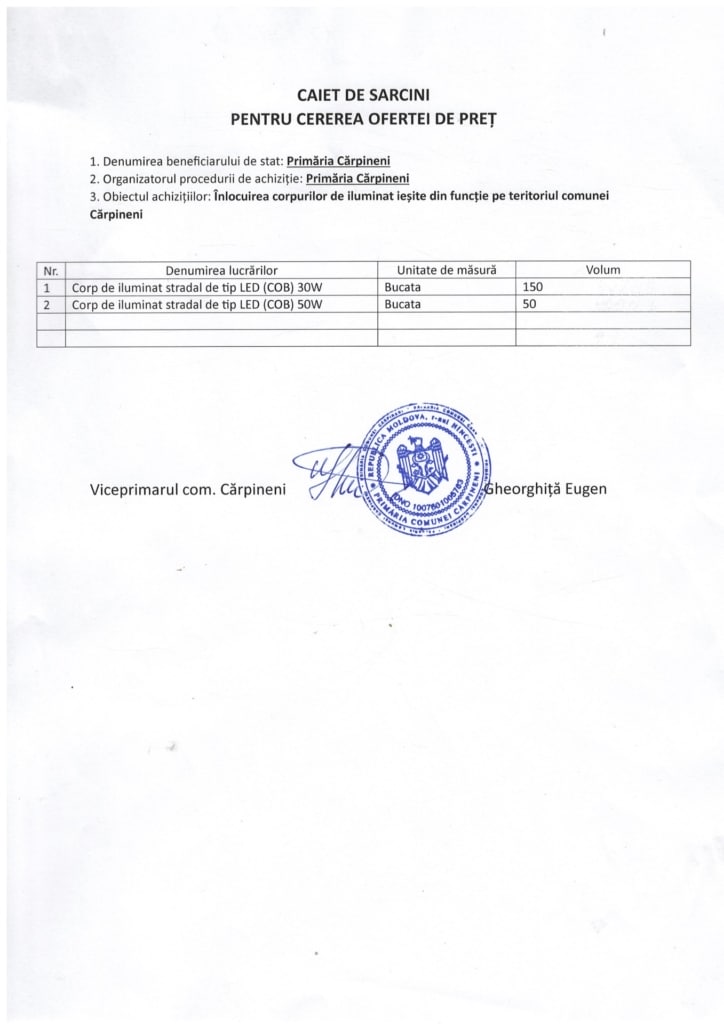 Primăria com. Cărpineni anunță achiziția corpurilor de iluminat stradal, conform caietului de sarcini si specificații tehnice.
