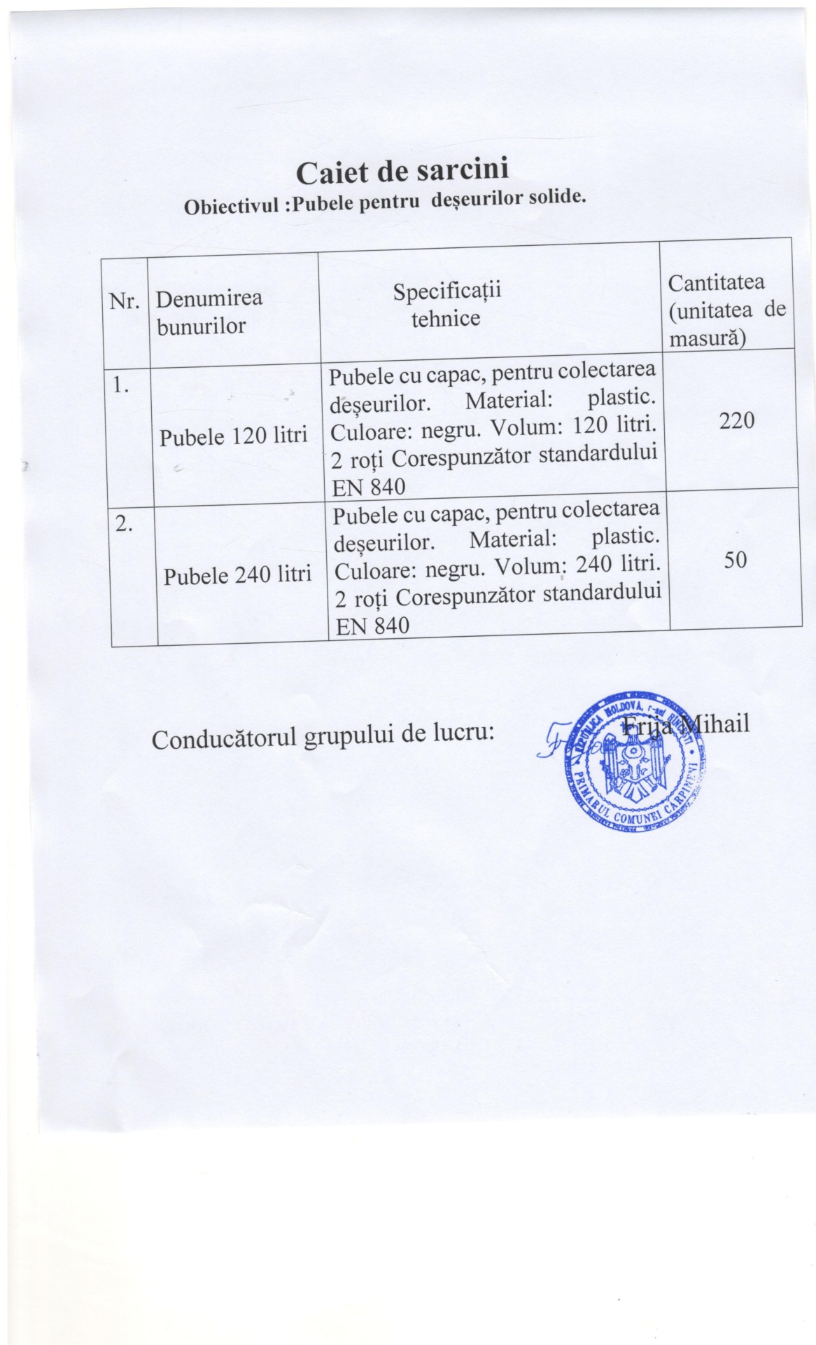 Primăria comunei Cărpineni anunță organizarea achiziției ce ține de ”Procurarea pubelelor pentru deșeuri solide”, conform caietului de sarcini anexat.